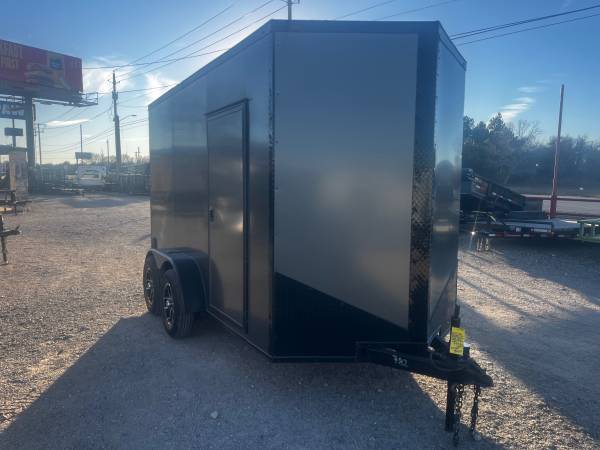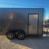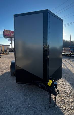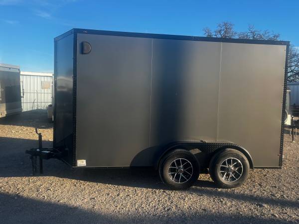 New 2026 6'x12' & 7' tall Screwless Polycore exterior Enclosed cargo trailer, 2-3500# axles with electric brake on rear, rear ramp rated at 3500#'s, mag aluminum wheels, vnose, 3/4" floor plywood on 16" centers, 3/8" wall on 16" centers, charcoal grey.