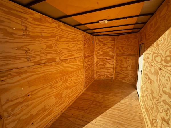 New cargo 6’x12’ & 6’5” tall inside 6’ at ramp, single idler axle 3500#’s, 2” coupler, wedge nose, rear ramp & rear stabilizer jacks, dome lights, diamond plate gravel guards, side access door, black mod wheels, 25/75-15 tires, 3/4” plywood floors, 3/8” plywood walls.