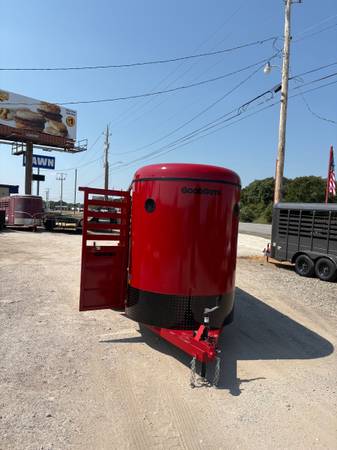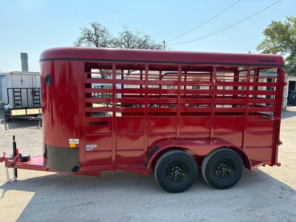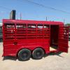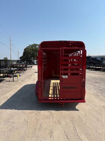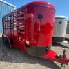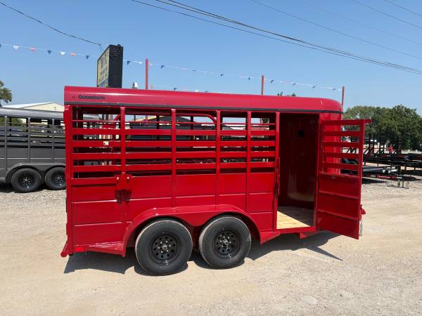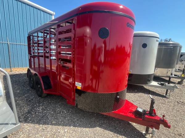 New Goodguys 5’x14’ Livestock bumper pull trailer, 6’6” tall, 2-3500# ezlube brake axles, full swing half slide rear gate, full walk out side access, 2” demco latch coupler, center easy latch divider gate, red and blackout trim.