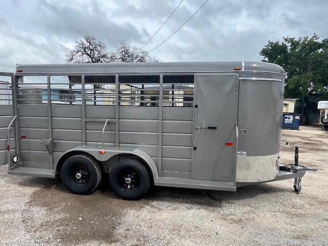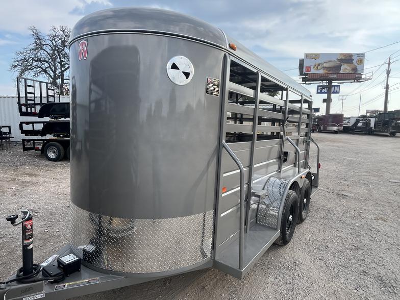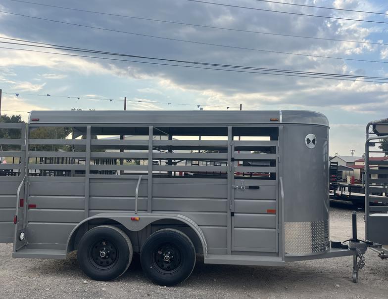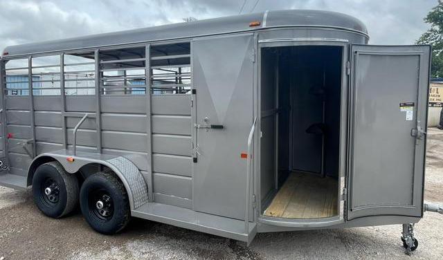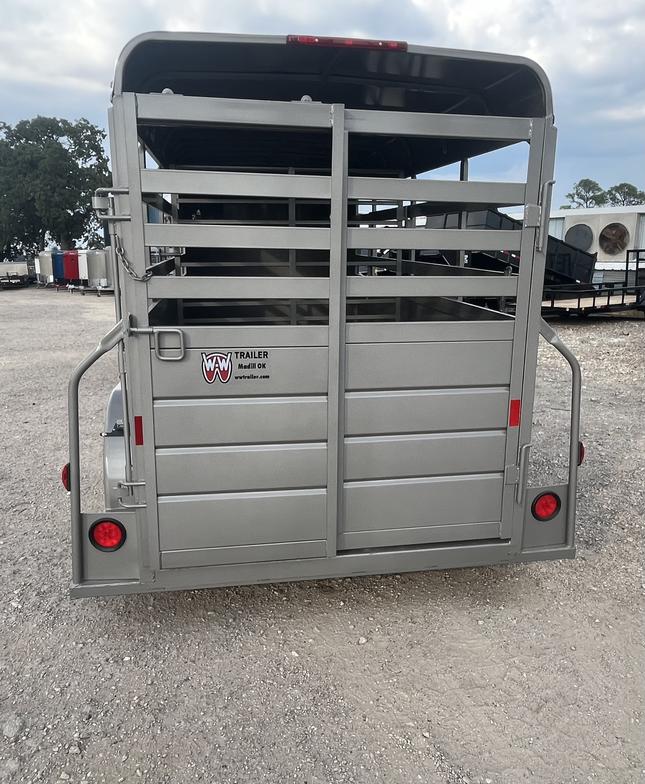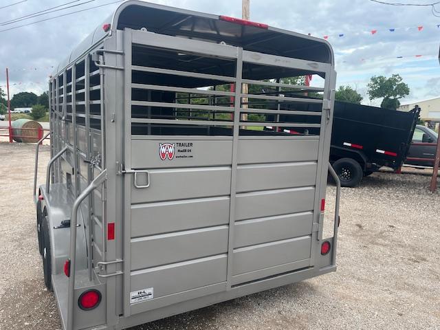 2025 WW 5’x14’x6’2” tall allaround bumper stock trailer, with 4' solid sides, 2-3500# torsion brake axles, full swing half slide rear gate, swing center gate, gravel guard, circle vents, treated floor. spare rack spare tire additional if needed.