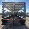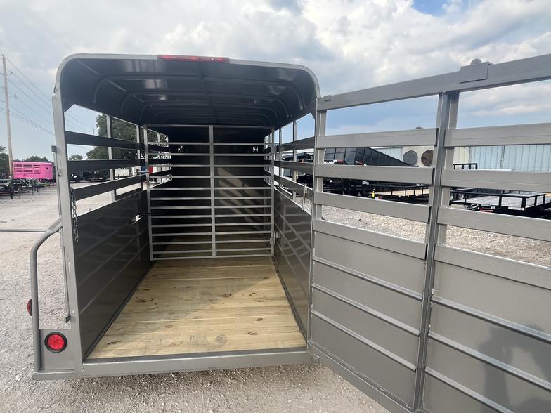 2026 6’x14’ & 6’6” tall Rancher bumper pull, 2-3500# drop spring axles with electric brakes, full swing 1/2 slide rear gate, side access door, center swing gate, 2” demco coupler, 225/75 15 8 ply and black 6 hole wheels, empty @2400#’s carrying capacity is 4600#’s, moonrock grey and blackout trim package, treated wood floor. IN STOCK