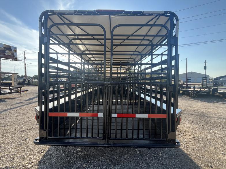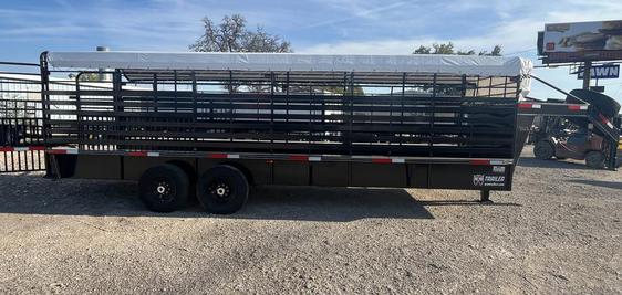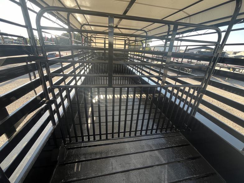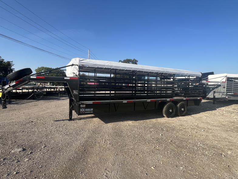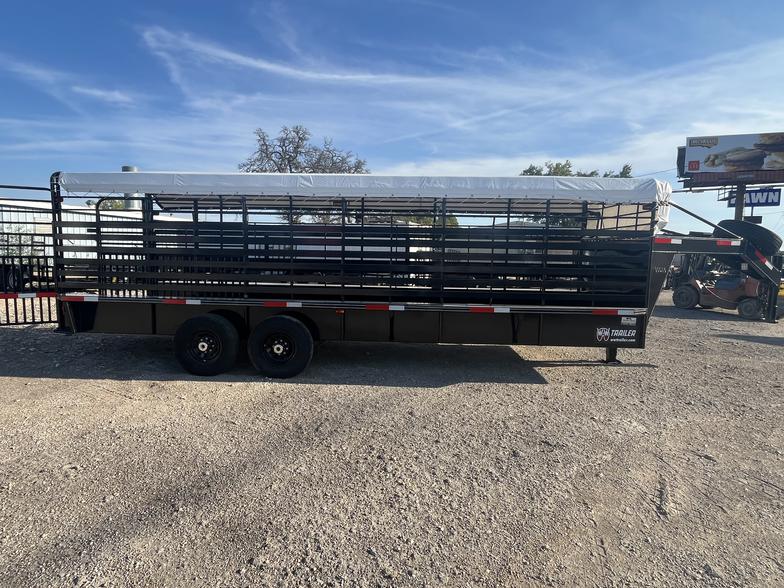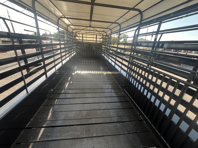 🔥Brand New 2026’ WW 6’8”x24’ Roustabout bartop Livestock with tarp, 2-7k torsion brake axles, 10 ply tires, spare on neck, butterfly rear gates, 1”x3” Tubing side above brush fenders, spaced wood floor for easier clean out, 2-center easy latch slam gates, 3-8’ sections, Available Now!!!