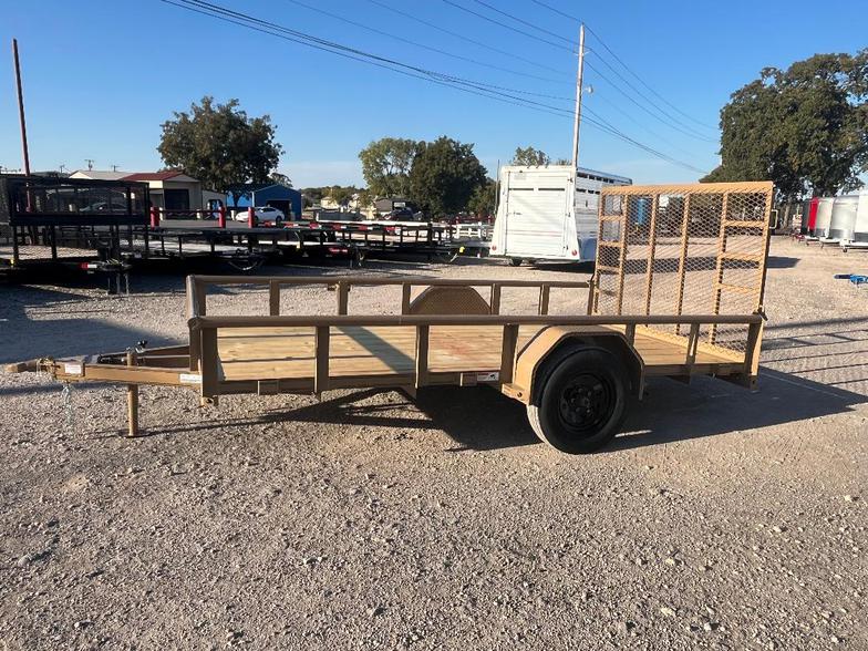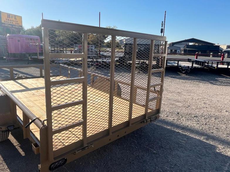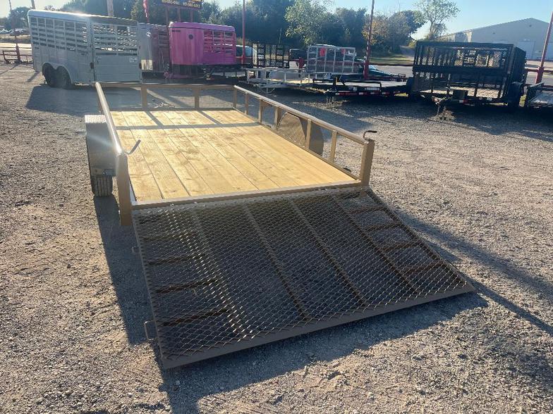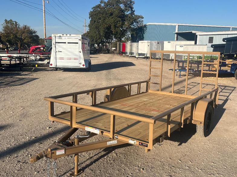 2025 77”x12’ Single axle utility trailer, pipetop railing, flip jack, 2” ram coupler, 4’ extra supported rear ramp gate spring assist, treated floor, LED flush tail lights buckskin tan color.